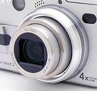 The new V1 model is boxy and compact, shaped like a familiar 35mm rangefinder models of years past. The V1's 5.0-megapixel CCD captures high resolution images, and its full complement of exposure modes provides as little or as much control as you might want. Looking at the "compact rangefinder" form factor, Sony decided that the market need a camera that size with both a 4x zoom lens and a 5-megapixel CCD, and the V1 was born, a compelling combination. But what's most impressive about the V1 is its inclusion of Sony's NightShot, NightFraming, and Hologram AF technologies, which greatly add to the camera's flexibility and usefulness in low-light shooting conditions. An expanded Scene exposure mode also now offers Snow and Beach settings, increasing preset options beyond the standard Twilight, Portrait, and Landscape offerings. Finally, the V1 also offers Sony's new "Smart Zoom" technology, for better image quality with digital zoom, as well as their new MPEGMovie VX format, allowing movie and sound recording at VGA quality, to the capacity of the memory card. Finally, the V1 features true Through-The-Lens (TTL) flash metering.