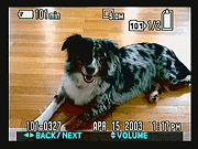 The DSC-V1 is somewhat unique at this point in the market, being the first camera to combine a 5-megapixel CCD with a 4x optical zoom lens. (There are five-megapixel cameras with 3x zooms, and four-megapixel models with 4x zooms, but the V1 will be the first 5MP/4x design that's hit the shelves.) As with other high-end Sony digicams, the V1 features a high-quality, Carl Zeiss lens for capturing sharp details. The 4x, 7-28mm lens offers a maximum aperture of f/2.8 - f/4.0, depending on the zoom position. In addition to optical zoom, the V1 offers Sony's new "Smart Zoom" digital zooming technology, designed to preserve image quality when digitally enlarging images. (Smart Zoom avoids loss of image quality by limiting the digital zoom range to only that which can be achieved without interpolation, based on the currently selected resolution setting.) While Sony has coined the term "Smart Zoom" for this feature, the V1 is hardly the first camera to employ this approach. (This is how digital zoom works on many of Fuji's consumer digicams.) Still, I heartily support this approach to digital zoom, as it seems a little less deceptive, and in any event will avoid interpolation artifacts.) With Smart Zoom enabled, the V1 can digitally enlarge images up to 4x, depending on the resolution. (The highest digital magnification is only available at the camera's lowest, VGA resolution setting. Larger image sizes result in proportionately lower digital zoom ratios.) The V1 offers manual focus in 14 distance presets and an autofocus whose target can be widened or narrowed and moved around to five different positions within the frame. Focus mode options include Single, Continuous (continuously adjusts focus), and Monitor. (This last mode appears to be something between normal on-demand autofocus and fully continuous AF, "monitoring" the focus status to permit slightly faster shutter response, perhaps with less battery drain than full continuous AF.) There's also a Macro mode for shooting close-up subjects. A unique, Sony-only feature the V1 shares with the F717 that went before it is Hologram AF, which uses a laser diode and a holographic diffraction grating to produce a crosshatched autofocus-assist pattern of bright red lines on the subject. This projected pattern stays more or less "in focus" almost irrespective of subject distance, so there's always a sharp pattern for the camera to focus on. Hologram AF isn't just for low light. You'll see the pattern projected in fairly normal lighting when there's not enough contrast in the subject for the contrast-detection AF system to focus effectively.