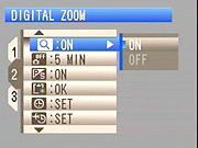 Digital Zoom: Enables or disables the camera's 5.7x digital zoom. If enabled, the camera will pause when crossing the boundary at which the optical zoom is at full telephoto and the digital zoom is enabled. You must let go of the zoom rocker briefly and then press it again to continue from the optical to digital zoom, or vice versa. - Auto Power Off: Turns the power save option off, or sets it to shut down the camera after two or five minutes of inactivity.