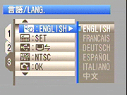 Language: Sets the menu language to English, French, German, Spanish, Italian, Chinese, or Japanese. - Background Color: Lets you select the color scheme for the camera's menus, with options being light / dark blue, light / dark purple, light / dark pink, light / dark orange, light / dark green, and grey / black.