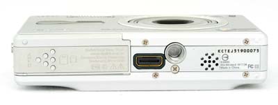 On the bottom panel of the Kodak V550 are the tripod mount, dock jack, and battery / memory card compartment. The metal, threaded tripod mount is just off-center and too close to the battery / memory card compartment for quick battery changes while working with a tripod. The battery / memory card compartment features a locking, hinged door, which slides forward to open. Inside, the battery pack and SD card slots line up side-by-side, and a small ejection lever locks the battery in place or releases it. (The SD card is ejected by pressing it down quickly, which pops it out slightly.) The dock connection jack connects the camera directly to the EasyShare dock for quick image downloading.