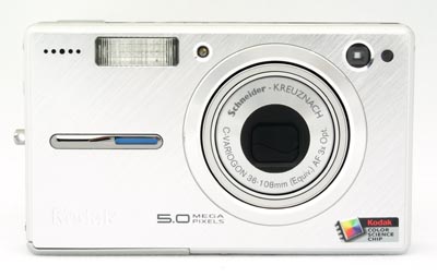In more than a slight departure from the handful of well-known Kodak EasyShare digital camera designs, this newest member of the pack is ultra-thin and fashion-forward. Featuring a brushed-metal front panel and minimalist design aesthetic, the Kodak EasyShare V550 will likely turn a few heads. Part of what Kodak calls the "Pocket Series," the V550's innovative design includes a set of flat control buttons on the top panel, which are actually part of the panel itself. (I'll describe them further in the Design section.) Accompanying the Kodak EasyShare V550 is a round, and likewise very thin, Photo Frame dock that escapes the boxier designs of previous EasyShare docks. The Photo Frame dock turns the camera into a picture frame when attached, displaying captured images either as a slide show or individually. (The dock also provides the same battery charging and image downloading functions as the standard EasyShare camera docks.) The Kodak V550 boasts a 5.0-megapixel CCD and very large, 2.5-inch LCD monitor, with a very user-friendly point-and-shoot format. Measuring a mere 3.7 x 2.2 x 0.9 inches (94 x 56 x 22 millimeters), and weighing only 5.71 ounces (162 grams) with the card and battery, the V550 is quite at home in a shirt pocket or tiny purse, excellent for travel.