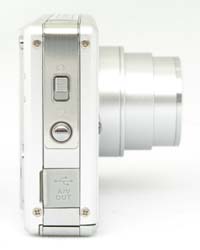 On the right side of the camera (as viewed from the rear) are the Auto/Favorites switch, a shiny, silver eyelet for attaching the wrist strap, and the AV Out / USB shared connector jack. The jack is beneath a flexible, plastic flap that folds out of the way to reveal the terminal.