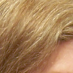 | Pretty good definition of high-contrast elements. | Subtle detail: Hair Noise suppression tends to blur detail in areas of subtle contrast, as in the darker parts of Marti's hair here. |