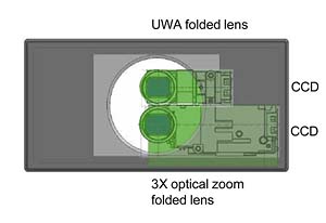 At first blush the Kodak V570 is just another small, stylish digital camera with a 5.0 megapixel imager. Closer inspection reveals a 2.5 inch LCD screen, a slim, lightweight body, and a retro, almost console-TV design sensibility. It's when you power the camera up and that lens cover slices out of the way that the uniqueness begins to show. No lens comes out--but that's not unusual. Many digital cameras have folded optics where the entire lens is inside the camera body. The surprise is that there are two lenses. The one on top is not just an artistically-placed optical viewfinder, it's another lens. Two folded optics, each with their own 5.0 megapixel sensor. The Kodak V570's top lens is wide angle, fixed at 23mm, and the bottom lens is a 39-117mm zoom.