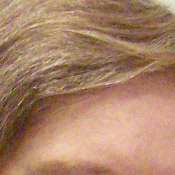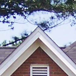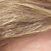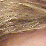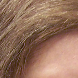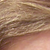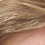 Noise-suppression systems in digital cameras tend to flatten-out detail in areas of subtle contrast. The effects can often be seen in shots of human hair, where the individual strands are lost and an almost "watercolor" look appears. The crop at far right shows this, with darker areas of Marti's hair showing only limited detail, even though individual strands are quite visible against her cheek in the uncropped image. You can also see the effect in the bricks and shingles in the picture at left. (The level of detail loss shown here isn't all that obvious on prints 8x10 inches or smaller though.)