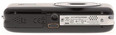 The bottom of the Kodak V803 hosts the speaker on the left, a plastic tripod socket in front of the dock connector near the middle, and the battery/memory card compartment on the right. Four small feet steady the V803 when you set it down.