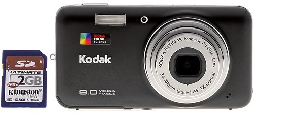 Kodak has based the design of its V803 and V1003 on color rather than shape. Longer than a credit card and thicker than a deck of cards, the body shape seems slim thanks to its rounded corners and the chrome trim that runs around the top three sides. At 4.1 x 2.1 x 1.0 inches (10.3 x 5.4 x 2.5 cm), it weights 5.73 ounces (162.5 grams) with a battery and memory card. But it's the color that Kodak hopes will attract you to this digicam. Kodak has tagged the color options Golden Dream, Pink Bliss, Cosmic Blue, Red Shimmer, White Glaze, Mystic Purple, Midnight Black, and Silver Essence, hoping one of those will be "undeniably you," according to the company.