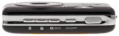 The Kodak V803's top panel has a shallow, chrome channel running the length of it. At the far right is the large Shutter button. At the far left is a set of three small buttons with blue LEDs to indicate operational status (Favorites mode, Movie mode, and Auto/Scene mode) and battery charging status. And in-between is the small Power button.
