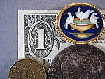 - Closeups: A small macro area with good detail. Flash is blocked by the lens. The Sony DSC-W1 performed quite well in the macro category, capturing a minimum area of 2.31 x 1.74 inches (59 x 44 millimeters). Resolution was high, showing a lot of fine detail in the dollar bill, coins, and brooch (though the coins and brooch are soft due to the close range and limited depth of field). As is often the case with digicams I test, all four corners of the frame are somewhat soft, an unfortunate limitation of digicam lenses in macro mode. The W1's flash almost throttled down enough for the macro area, but was still a little bright, and was blocked by the lens in the lower portion of the frame. (Plan on using external lighting for your closest macro shots.)