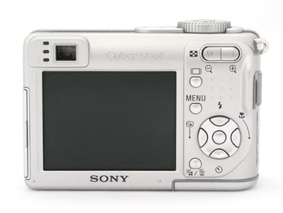 A little taller and thicker than the P100, the Sony DSC-W1 is also not as wide, taking up only a little more volume overall. Its major advantage over the P100 is its 2.5 inch LCD that absolutely dominates the back of the camera. To get this fine and useful display used to require purchase of the $550 T1. Now it can be had for $150 less in an equally capable camera, plus the addition of something the T1 lacks: an optical viewfinder.