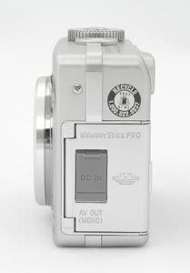 The left side has a large plastic door that springs open when swung about 45 degrees wide. Here we find the Memory Stick slot, an AC power jack and the A/V jack. Oddly, here also is the Memory Stick access light, which is covered by the door. (Although you'll certainly be able to see it if you open the memory compartment door to remove the Memory Stick while the camera is still writing to it. - Just wait for the light to go out before pulling the card.) A small rubber sub-door is embedded in the big plastic door, giving easier access to the AC power plug.
