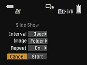 - Slide: Plays back images in an automatic slide show. You can set the time interval and whether or not the sequence of images repeats. (secondary screen)