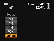 - Resize: Resizes the image to 2,592 x 1,944; 2,048 x 1,536; 1,280 x 960; or 640 x 480 pixels. (When an image is resized, the original image is left in place, and a new copy is made at the selected size.) (secondary screen)