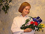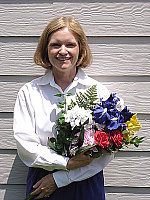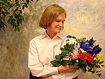 flower bouquet, good exposure with a contrast adjustment. Accurate color. The extreme tonal range of this image makes it a tough shot for many digicams, which is precisely why I set it up this way, and why I shoot it with no fill flash or reflector to open the shadows. The object is to hold both highlight and shadow detail without producing a "flat" picture with muddy colors, and the Cyber-Shot DSC-W1 did a pretty good job, though contrast is quite high. The shot at right was taken with a +0.7 EV exposure compensation adjustment, which results in slightly dark midtones due to the high contrast. The highlights have limited detail, as do the deep shadows. I shot the main series with the camera's Low Contrast setting, which did a good job of bringing the contrast back in line, though the highlights are still quite bright. I chose the Auto white balance as the most accurate overall, though the Daylight setting also looked good. Skin tones are about right, and the blue flowers in the bouquet look pretty good as well. (Many digicams have trouble with this blue, and the W1 does produce slight purplish tints in them. However, accuracy is pretty good.) The strong reds and greens also look good, though the red flowers do have a pinkish tint. Resolution is very high, with a lot of fine detail visible in the flower bouquet and on Marti's features (though Marti is a bit soft from the autofocus). Shadow detail is good, with moderately low noise. To view the entire exposure series from zero to +1.0 EV, see files W1OUTAP0LC.HTM through W1OUTAP3LC.HTM on the thumbnail index page.