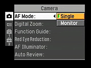 AF Mode: Sets the focus mode to Single, or Monitor. (Monitor is Sony's term for continuous autofocus.) - Digital Zoom: Switches between the up to 14x Smart Zoom and Precision zoom, or turns digital enlargement off. (Smart Zoom values will depend on the resolution selected, 14x is the max at VGA resolution.)