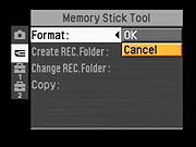 Format: Formats the Memory Stick, erasing all files (even protected ones). - Create REC Folder: Creates a new folder for recording images.