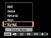Color Mode: Offers Normal, Rich, Natural, Sepia, and Black & White color modes. - Focus: Sets focus control to Multi AF or Center AF, or one of five preset focus distances (0.5, 1.0, 3.0, and 7.0 meters, and Infinity).