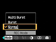 Mode: Sets capture mode, Normal (single), Burst, and Multi-burst. - Interval: When in Multi-burst mode (grayed out otherwise), sets the capture interval between 1/7.5, 1/15, and 1/30.