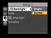 LCD Backlight:Controls the brightness of the LCD display, with options of Bright or Normal. This can also be cycled between normal and bright during picture taking by holding the "disp" button down. - Beep: Controls the camera's beep sounds, turning them on or off. A Shutter option enables only the shutter beep noise.