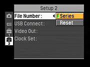 File Number: Chooses between Series (continuing the shot number in the file name indefinitely) or Reset, which resets the frame number by folder and when the card is changed or formatted. - USB Connect: Sets the USB connection type to PictBridge, PTP, Mass Storage, or Auto.