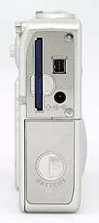 The opposite side of the camera is featureless, with no connectors or controls on it at all. This view of the camera shows the decal that illustrates the clever lens design Minolta is so justifiably proud of, as well as a small indention marked with the maximum optical plus digital zoom. Be reassured though, that the label can be easily removed after purchase, to result in a very sleek, elegant case design.