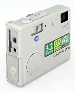 The Minolta DiMAGE X31 is one of the latest in Minolta's line of subcompact DiMAGE X models, using a unique "folded" lens design to achieve a remarkably compact form factor and very fast startup times. Minolta really turned heads when they introduced the original DiMAGE X, now nearly three years ago. A two-megapixel camera in the form of a square block of metal, just barely over three-quarters of an inch thick, the DiMAGE X was an immediate hit, as popular as a fashion statement as it was for its status as a go-anywhere, shoot-anytime digital camera. The X20 was the first affordable version of this popular camera, reducing the price by enclosing the same mechanism in a plastic body. While the metal versions of the X-series have gone as high as 5 megapixel, the X31 is the first resolution bump at the low end, now to 3.2 megapixels.