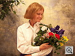 and nearly accurate color, though a slight red cast. The extreme tonal range of this image makes it a tough shot for many digicams, which is precisely why I set it up this way, and why I shoot it with no fill flash or reflector to open the shadows. The object is to hold both highlight and shadow detail without producing a "flat" picture with muddy colors, and the Dimage X31 produced good color but very high contrast. The shot at right was taken with a +0.7 EV exposure compensation adjustment, slightly less than average for this shot. The X31 held onto highlight detail pretty well here, but its high contrast left the shadow areas and Marti's skin tones rather dark, but the shot at +1.0 EV was badly blown out, so I settled for the 0.7 EV for the main choice here. Despite a slight bluish cast in Marti's shirt, I chose the Auto white balance as the most accurate overall, as the Daylight setting was a little too warm. Marti's skin tones look pretty good, neither too pink nor too pale. The flowers in the bouquet are rendered very well also, the blue ones a little darker than in real life, but with a more accurate shade of blue than is common, and the red ones with good shape and modeling, with little of the over-saturation that I often see with other digicams. Resolution is decent for the X31's 3-megapixel class, with a lot of fine detail visible in the flower bouquet. Shadow detail is a little limited, but image noise in the shadow areas is fairly low. To view the entire exposure series from -0.3 to +1.3 EV, see files X31OUTAM1.HTM