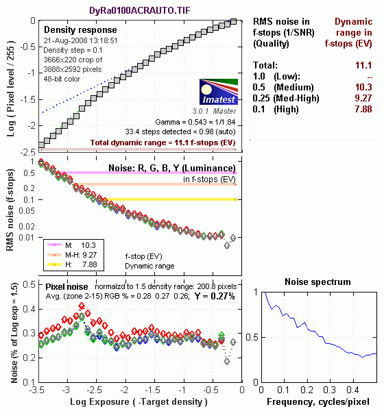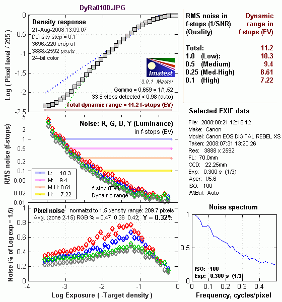 In comparing these graphs with those from competing cameras, I've found that the Noise Spectrum graph at lower right is the most important. Cameras that manage to shift their noise spectrum to higher frequencies have much finer-grained noise structures, making their noise less visually objectionable. In the graph above, this would show up as a noise spectrum curve that remained higher on the right side, representing higher noise frequencies. The champion at this was the Canon EOS-1Ds Mark II, which produced remarkably fine-grained image noise, even at very high ISOs.