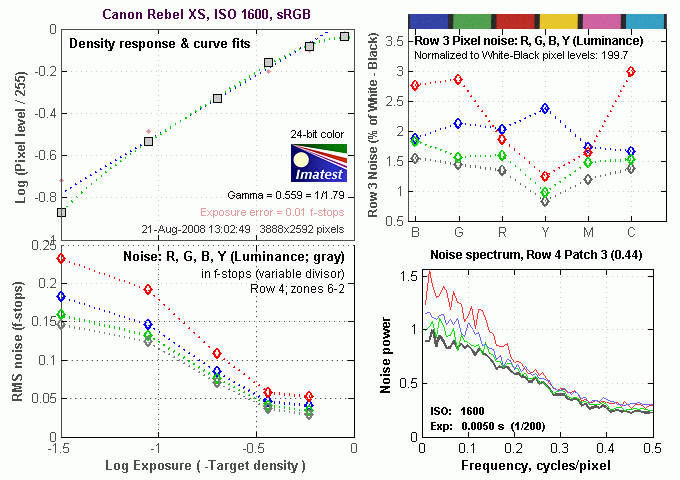 Here's the same set of noise data at ISO 1,600. Here, the Noise Spectrum graph for the luminance signal is shifted quite a bit more toward the left-hand, lower-frequency side than it was at ISO 100 (note how the whole graph is piled up on the left side of the plot), coarsening the "grain" of the image noise patterns. The red and blue channels still show more noise at lower frequencies than the green and luminance channels, which is somewhat unusual when high ISO noise reduction is active. (It's a bit more common for high-ISO noise reduction to flatten the noise more equally in all 3 channels.) When examining the XS's high ISO images, chrominance noise is more visible than some other competing models such as the Nikon D60, but the XS manages to hold onto a bit more detail.