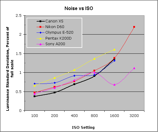 (Another thing that needs to be considered here is that we tested each camera at its lowest ISO setting, which should produce best-case noise levels. This is in fact what many photographers will be most interested in, but it does perhaps place some of the Nikons (like the D40) at a disadvantage, as their lowest ISO setting is 200, as compared to the ISO 100 settings available on most other models.)