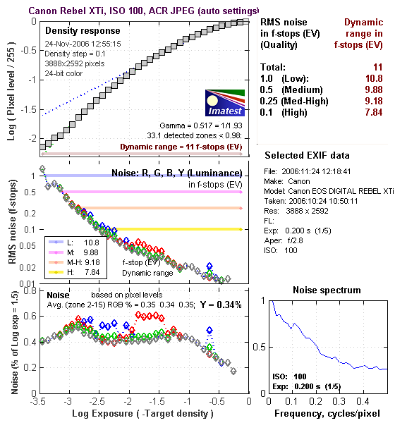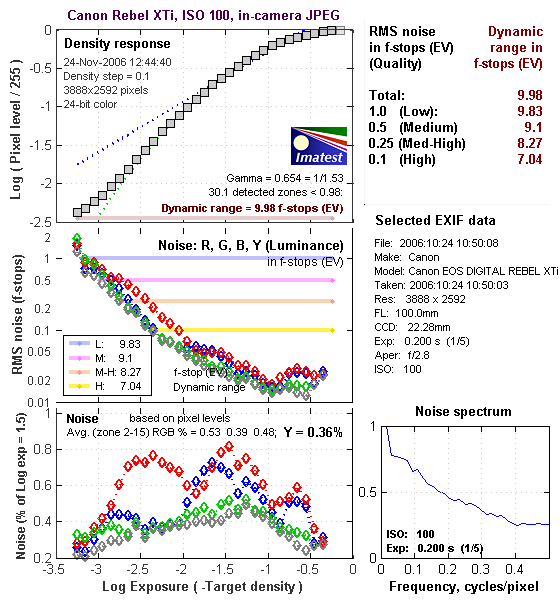 As always, there's a lot in this particular graph, a lot more than we have room to go into here. In comparing these graphs with those from other competing cameras, I've found that the Noise Spectrum graph at lower right is the most important. Cameras that manage to shift their noise spectrum to higher frequencies have much finer-grained noise structures, making their noise less visually objectionable. In the graph above, this would show up as a noise spectrum curve that remained higher on the right side, representing higher noise frequencies. The champion at this was the Canon EOS-1Ds Mark II, which produced remarkably fine-grained image noise, even at very high ISOs. Bottom line, the Canon XTi's noise levels are low at low ISO, and the frequency spectrum somewhat favors high frequencies, but there's a spike at very low frequencies that would normally translate into a blotchy appearance, were the overall level of the noise high enough to be seen (it isn't).