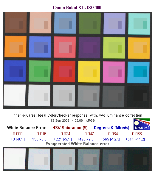 This image shows how the Canon Rebel XTi actually rendered the colors of the Macbeth chart, compared to a numerically ideal treatment. (Apologies for the tilt, the Macbeth chart on our Multi target had slipped slightly in these shots.) In each color swatch, the outer perimeter shows the color as actually captured by the camera, the inner square shows the color after correcting for the luminance of the photographed chart (as determined by a 2nd-order curve fit to the values of the gray swatches), and the small rectangle inside the inner square shows what the color should actually be, based on perfect rendering in the sRGB color space. This image shows the excellent hue accuracy, as well as a gamma curve that results in an overexposure of highly saturated swatches.