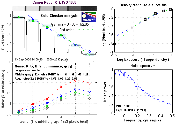 Here's the same set of noise data at ISO 1600. Here, more of the mass of the Noise Spectrum graph is shifted toward the left-hand, lower-frequency side than it was at ISO 100, coarsening the "grain" of the image noise patterns. Not bad, but there's quite a lot of noise energy present in the left-hand side of the graph, from 0.0 to 0.2 cycles/pixel, rather than in the range from 0.2 to 0.5 cycles/pixel. This is visible in its images, where the XTi's luminance noise is generally higher than that of the Nikon D80. (There is very interesting and subtle difference in the noise spectra of the two cameras though: The D80's has a spike leading right up to zero frequency, whereas the XTi has a dip there. This shows up in high ISO shots as a slightly "splotchy" look to large, uniform dark areas in the D80's images that isn't shown by the XTi's. (You can see this in the black surround on the MacBeth chart in our Multi Target shots.
