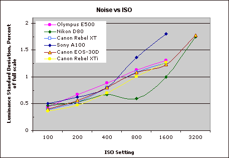 This chart compares the Canon XTi's noise performance over a range of ISOs against that of other cameras. While I continue to show noise plots of this sort because readers ask for them, I each time point out that the noise magnitude is only a small part of the story, the grain pattern being much more important. There's also the matter of how much subtle subject detail is traded away in pursuit of low noise figures. In the case of the Canon Rebel XTi, while it shows slightly better than average noise levels at higher ISO, it does let through quite a bit more noise than does the Nikon D80 under similar conditions. The upside to this is that the XTi does a much better job of holding onto fine subject detail in areas of subtle contrast. (For instance, check out the red fabric swatch with the black leaves in our Still Life test shot, and compare the detail there with that from the Nikon D80.)