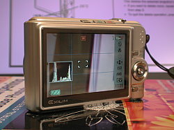 The back of the Casio EX-Z1000 has a few ridges in the top right corner impersonating a thumb grip. Below that is the Menu button which is mirrored on the opposite side of the Navigator and its Set button by the Best Shot or Scene mode button. Most of the real estate is taken up by the 1.5x2-3/8 inch LCD, an unusual format but well employed to display shooting options along the right side.