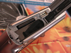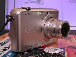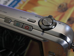 The front of this metal-bodied Casio EX-Z1000 has a large opening for the extending lens in the lower right corner. The lens is protected by a split lens cover and extends a full inch (and pretty quickly, too). Hard to believe there's room in that thin body for a lens that deep, but it is constructed in three parts. Above the lens and slightly to the left is the autofocus assist/self-timer lamp and just down the curve of the lens a bit more is the tiny hole for the microphone. You can store mono audio clips with images, capture sound movies, and record voice memos, too. Above the Casio EX-Z1000's mic is the small flash.