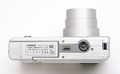 The EX-Z3's bottom panel is flat and smooth, featuring a metal-threaded tripod mount, the Cradle connector jack, and the memory card and battery compartment. (Kudos to Casio for using metal for the tripod socket, rather than the more common plastic.) A sliding door protects the memory card and battery compartment, and slides out before opening. Inside, the battery and SD/MMC card slots line up side by side. Though the battery compartment is too close to the tripod mount to allow quick battery changes while shooting with the camera on a tripod, I doubt this will be much of an issue with the camera's users, given the camera's highly portable design.