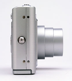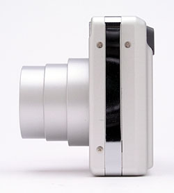 The front of the camera features the lens, flash, optical viewfinder window, self-timer lamp, and tiny microphone. A shutter-like, retractable lens cover protects the lens whenever the camera is powered off, sliding quickly out of the way when the camera is turned on. The lens then telescopes out from the camera body a bit less than an inch into its operating position. When powered off, the front of the camera is flat with only a thin raised finger grip, so be sure to keep the wrist strap securely around your wrist when holding the camera.