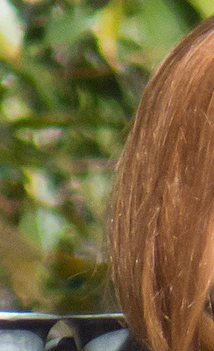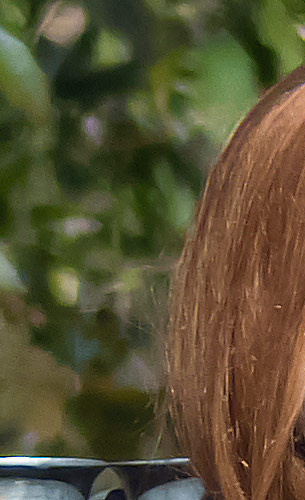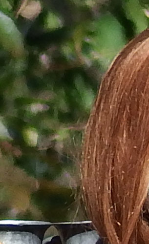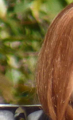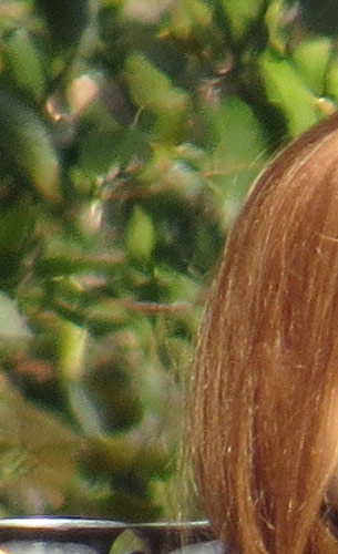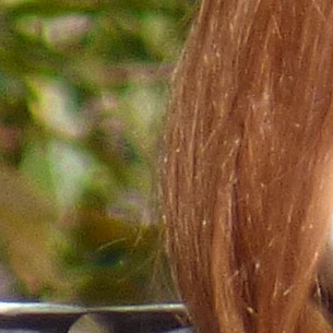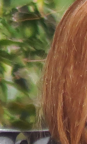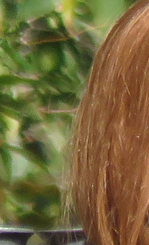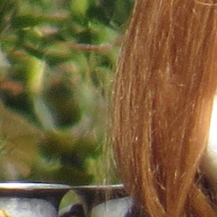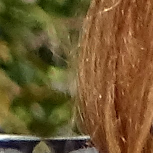 The crop table below shows the contrast between the hair of the wig (our primary focus target) and the blurred bushes in the distance, revealing both detail handling and blur rendering. The trick is to show natural detail with such a tiny sensor, especially in areas of subtle contrast as in the hair and also produce natural-looking blur in the out of focus background area. In fairness to all of the cameras participating here, this is indeed a difficult feat to pull off, although a few did so quite well.