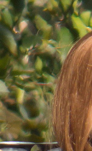 There's plenty of detail in this target to analyze, and the bushes behind the target provide a good opportunity to see what sort of background blur (bokeh) you can hope to achieve. Interestingly, while the bushes appear quite close to the subject, they are in fact more than 20 feet away, with the apparent closeness due to the extremely long focal lengths involved. In contrast, the Gena shot had a background several hundred feet away, and therefore had substantially different background blur for analysis.