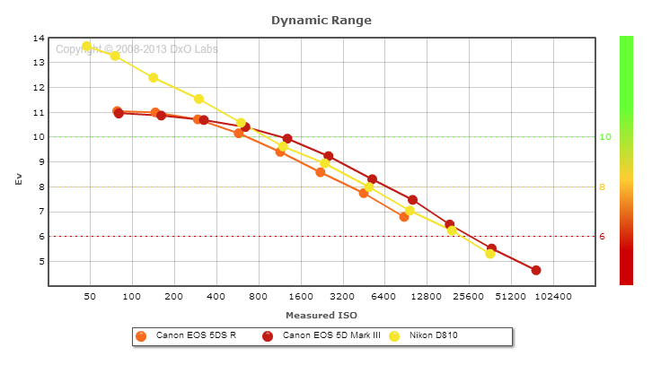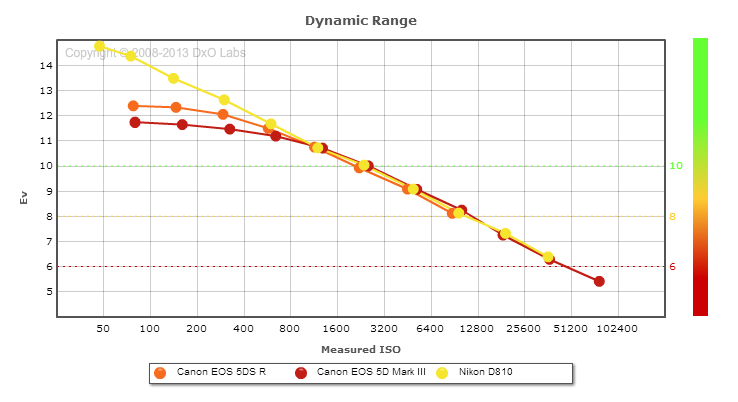 Here, we decided to compare the Canon 5DS R's dynamic range to the venerable 5D Mark III, and also to Nikon's top DSLR at time of writing, the D810. Note that the 5DS R and 5DS have identical dynamic range results. You can always compare other models on DxOMark.com.