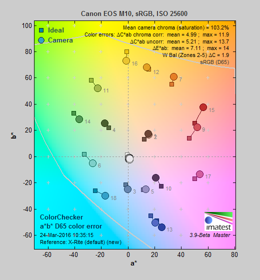 Saturation. The Canon EOS M10 produces images with mean saturation levels that are quite typical. Strong reds, oranges, dark greens, dark brown and dark blues are pushed by minor to moderate amounts, while yellow, light green and cyan are just slightly muted. The mean saturation of 110.6% (10.6% oversaturated) at base ISO about average for cameras we've tested, and mean saturation is quite stable as ISO rises to 3200, but falls off to a low of 103.2% at extended ISO 25,600. That's also typical, though, and overall saturation levels are quite pleasing. Most consumer digital cameras produce color that's more highly saturated (more intense) than found in the original subjects. This is simply because most people like their color a bit brighter than life.