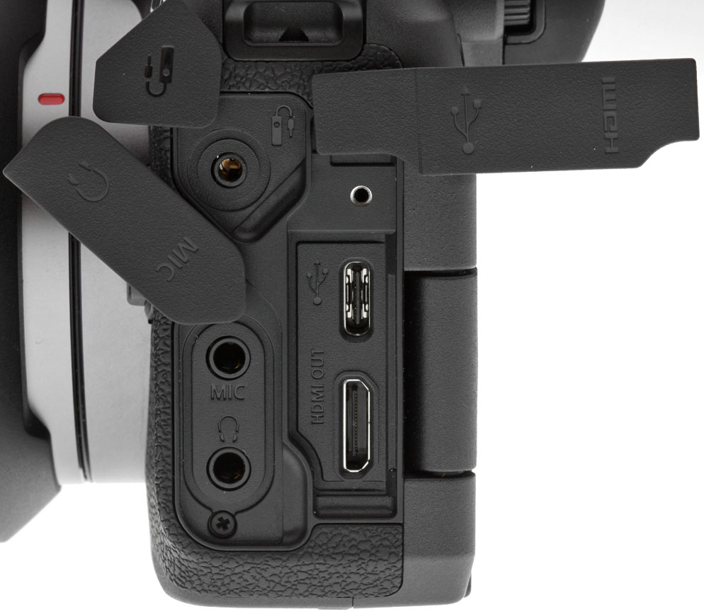 Wired connections include a USB-C SuperSpeed USB 3.1 Gen 1 port that supports in-camera battery charging with the optional PD-E1 USB Power Adapter, a Mini Type-C HDMI port that outputs clean 10-bit 4:2:2 4K video, a remote release jack compatible with the RS-60E3 remote switch, and of course, a flash hot shoe. The camera also provides 3.5mm stereo microphone and headphone jacks. A PC sync terminal is not located on the body, but is provided on the optional battery grip.