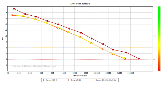 The Sony A7 III offers significantly better dynamic range than the Canon R across the ISO range, though, with over a 1.1 EV advantage at base ISO (14.65 vs 13.51 EV), which then varies between a minimum of about 0.4 EV higher at low ISOs, gradually increasing to over a 1.1 EV advantage again at the highest common sensitivity.