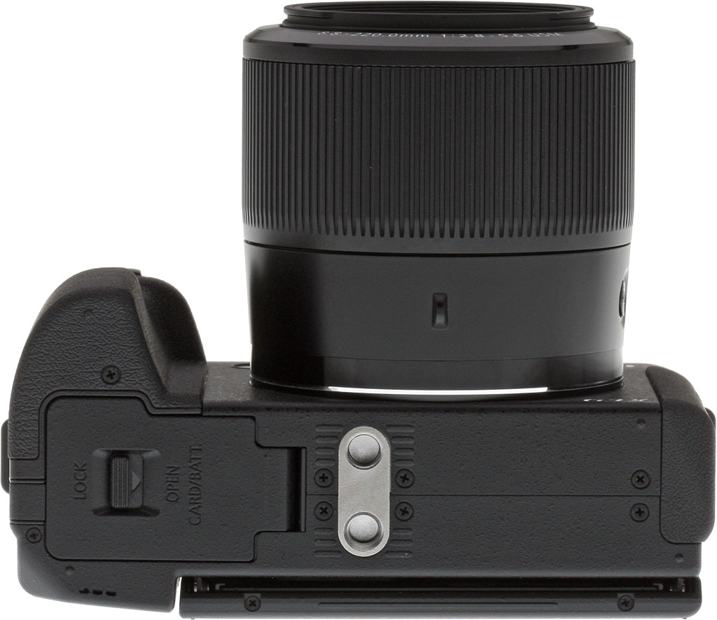 Jumping to the top deck, there's a whole lot more going on. Again, this viewpoint is dominated by the lens, and an interesting taper as it nears the camera body is apparent. (This gives just a little more room for your fingertips on either side of the body, and the taper begins immediately behind the generous, programmable lens ring.)