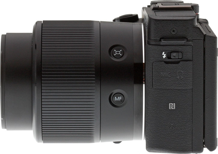 On the left side of the PowerShot G3X's body is but one control: You'll find the mechanical release switch for the popup flash here. Directly beneath it, a small flap covers both the microphone and headphone jacks, a location which means both can be used while shooting handheld since they won't significantly obstruct your grip.