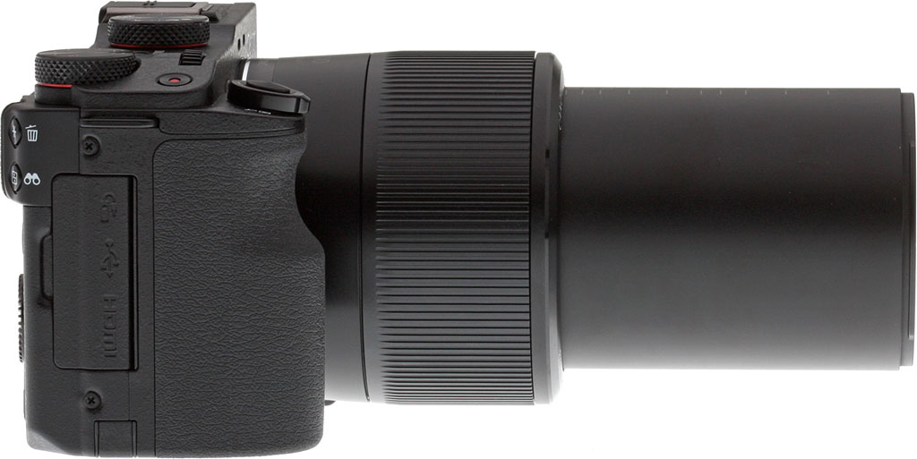 From left to right, the top of the Canon G3X offers up a popup internal flash, a hot shoe for external strobes, a mode dial, power button, front control dial, exposure compensation dial and movie record button. On top of the handgrip, the shutter button sits encircled by the zoom rocker.