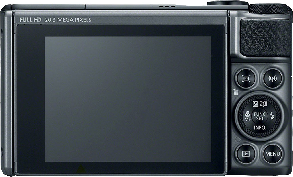 The front of the camera looks more or less the same, although it appears that the front grip material or at least the texture has changed. The new grip material is on the back as well. Further, the placement of the rear buttons has changed compared to the old model, although the overall layout is the same. There is a new feature on the back of the camera, however, as the rear 3-inch LCD can now tilt upward, whereas the display on the SX720 HS was fixed.