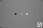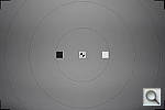 The test target here is our "new" flash range/uniformity target, first put into service in April, 2009. To avoid potential exposure problems caused by the target itself, we've gone to a mostly blank grey target, with a reflectance of 18% (matching the theoretical level that most exposure metering systems assume for average scene reflectance). The white and black chips let us check white and black points in addition to the mid-grey of the target itself. The concentric circles are a visual guide for flash falloff, marking points 25%, 50%, and 75% of the way from the center to the corners of the target. The bold black framing marks indicate the corners of either a 4:3 or 3:2 aspect ratio, for those shots in which we're checking flash uniformity. (See below.) For consistency of exposure, the target is mounted in front of backdrop paper that also approximates a 18% grey.